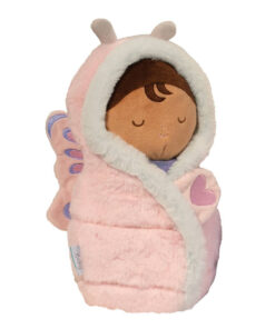 Snug in her cozy cocoon, a dreamy Baby doll waits to see what imaginative adventures the day will bring! Douglas’ Baby Hugs have been designed with creativity in mind and encourages interaction with their textures and innovative concept. Squeezably soft and dressed in gentle colors, Baby fits comfortably inside her matching themed swaddle accessory. Detailed with a heart embellishment, the swaddle can be wrapped snugly around Baby with its simple to use closure.Â
